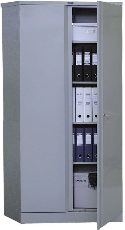 Двухстворчатый металлический шкаф с распашными дверьми, предназначенный для хранения крупных бумажных архивов, финансово-бухгалтерской отчётности и прочей документации в медицинских учреждениях любой направленности.