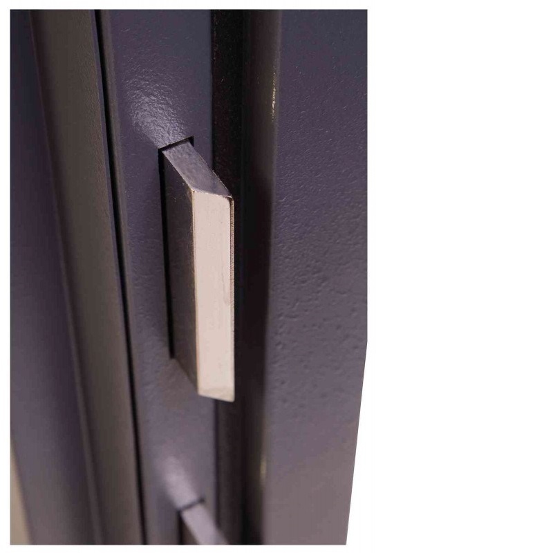 - Сейф HS9071E оборудуется четырёхсторонним ригельным механизмом, представленным семью прямоугольными стальными ригелями 100×10 мм – выдвигающимися с трёх сторон, а также пассивными (неподвижными) со стороны петель.