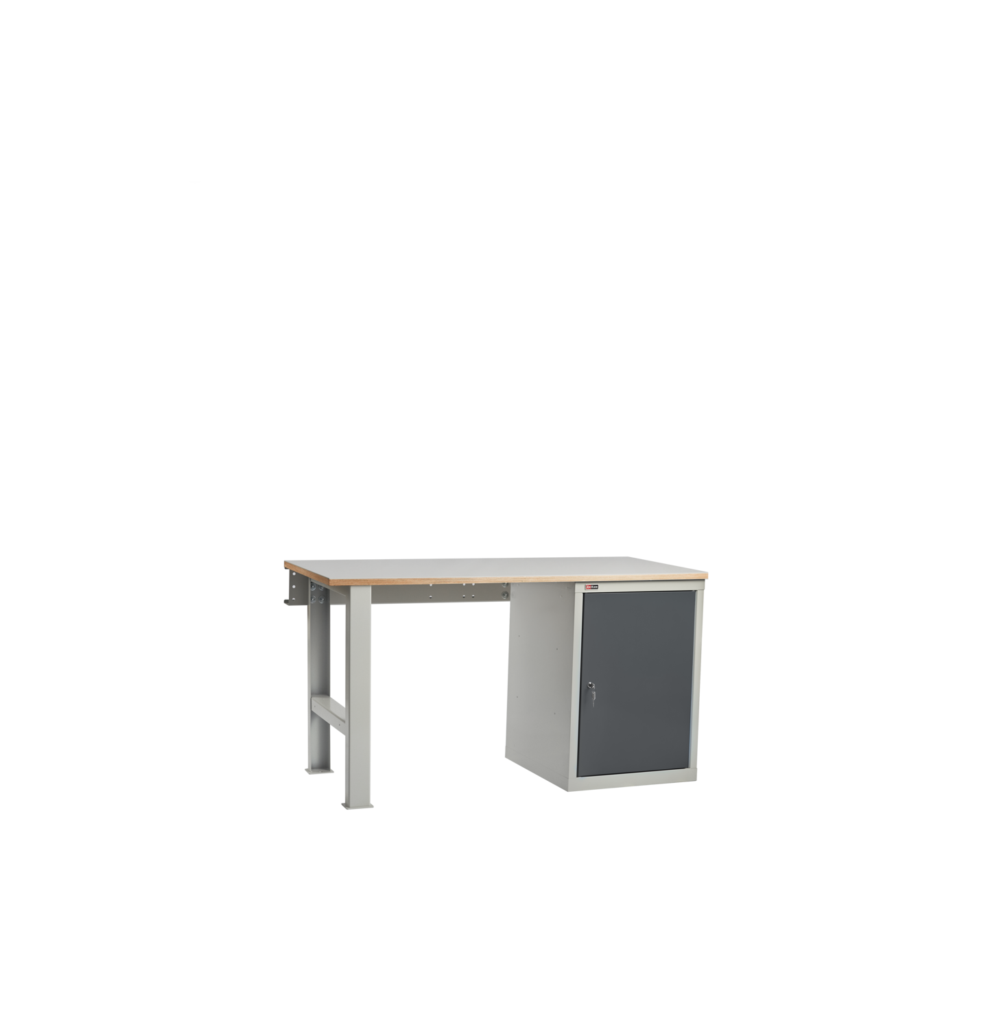 Основной функциональной частью верстака ВЛ-150-03 МФ комплектуется столешницей из влагостойкой фанеры толщиной 24 мм со стальным листом (3 мм) на рабочей поверхности и металлической сварной тумбой с распашной дверцей. Длина столешницы – 1500 мм, глубина – 700 мм. Все металлические элементы окрашены эпоксидной порошковой краской серого цвета (RAL 7038). Такая краска защищает от мелких царапин и появления коррозии.